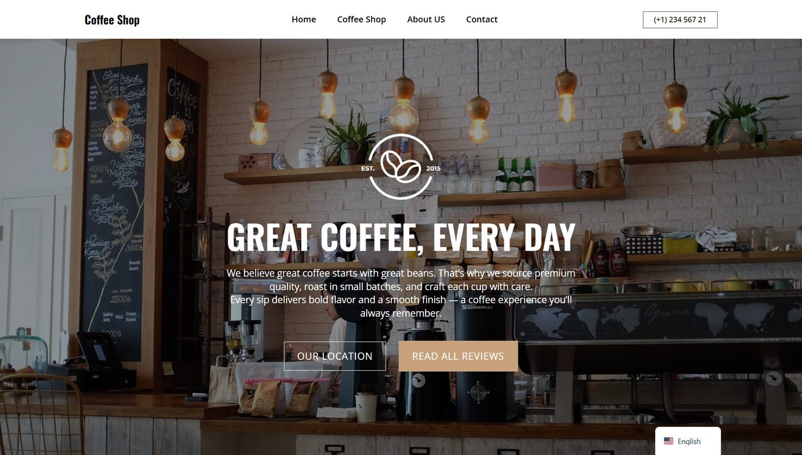 - Homepage – A welcoming homepage that highlights your coffee shop and invites visitors in