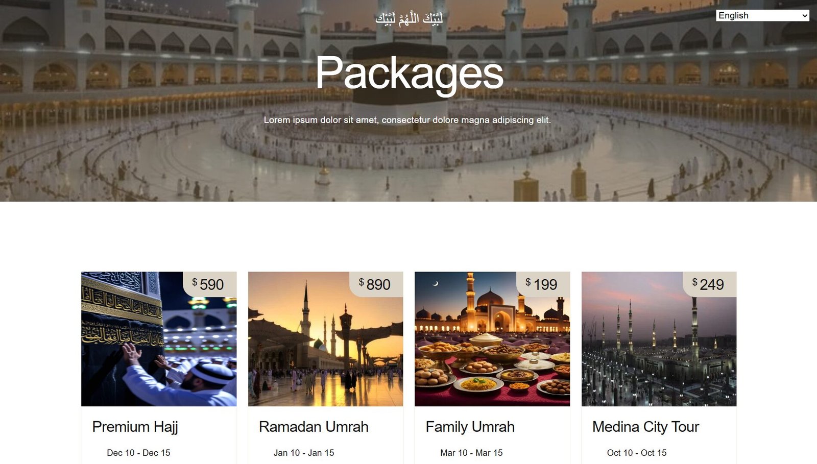 - Packages Page – Browse available Umrah and Hajj packages with clear details.